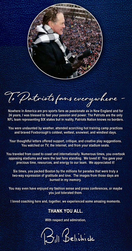 Source : www.patriots.comDan Roche on X: “Bill Belichick’s full page โthank youโ to